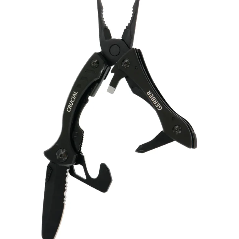 Crucial-monitoimityökalun taktinen versio, tyylikkään musta muotoilu. Toimitukseen sisältyy hihnaleikkuri, jota voi käyttää hätätilanteissa.