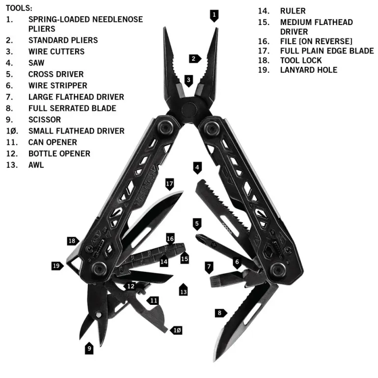 Yleismonitoimityökalu erilaisiin käyttötarkoituksiin, yhtä toimiva kotona kuin telttaretkellä. 17 toimintoa, muun muassa pihdit, sakset, pullonavaaja, naskali, viivoitin, viila sekä risti- ja tasapääruuvitalttojaLujatekoinen rakenne, lukittavat työkalut, puukko, jossa suora, osittain sahalaitainen terä.