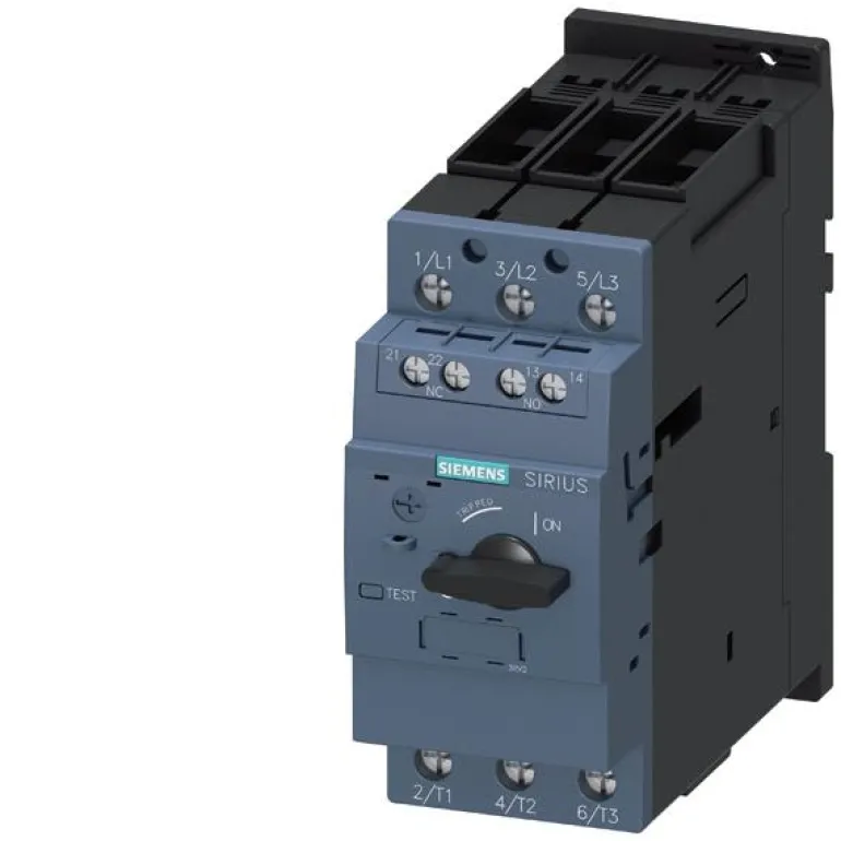 Virtakatkaisin, koko S2, jossa on yksi sulkeutuva + yksi katkaiseva apukosketin.