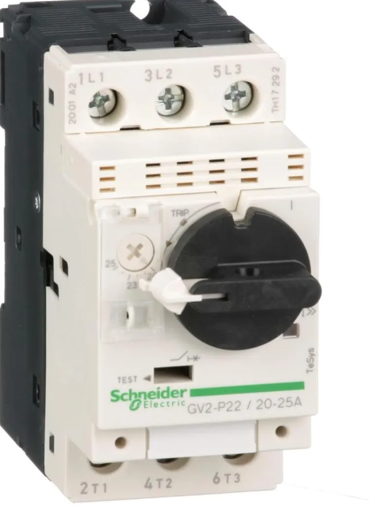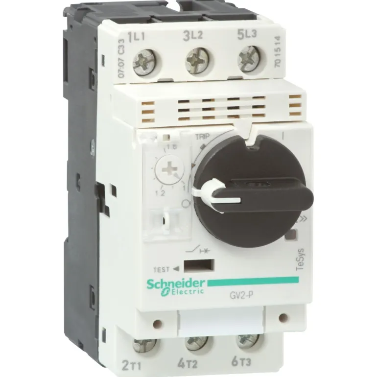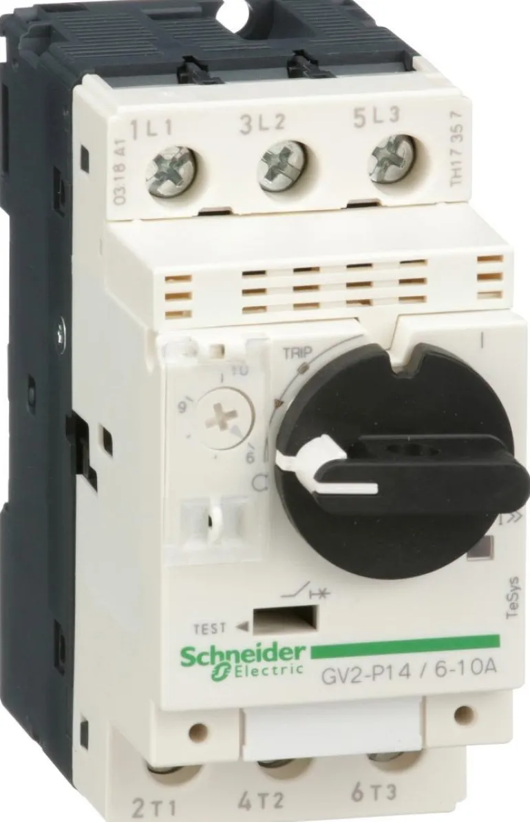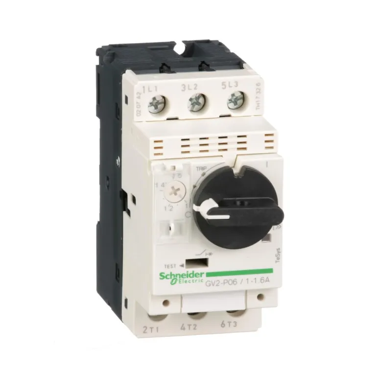 Schneider Electric GV2P10 -moottorin suojakytkin lämpömagneettisella laukaisulla. Varustettu vaihevikasuojalla. Jos oikosulkuvirta ei ylitä katkaisukapasiteettia, sulaketta ei tarvita. Pikakiinnitys asennettavaksi DIN-kiskoihin tai koteloihin. Tilasta riippumaton. 3-napainen lämpö- ja magneettisuoja, joka on erityisesti suunniteltu ohjaamaan ja suojaamaan moottoreita IEC 947-2 ja IEC 947-4-1 -standardien mukaisesti. Magneettisuojassa (oikosulkusuojaus) on kiinteä laukaisutaso, joka on noin 13-kertainen (± 20 %) lämpölaukaisun maksimivirtaan verrattuna.