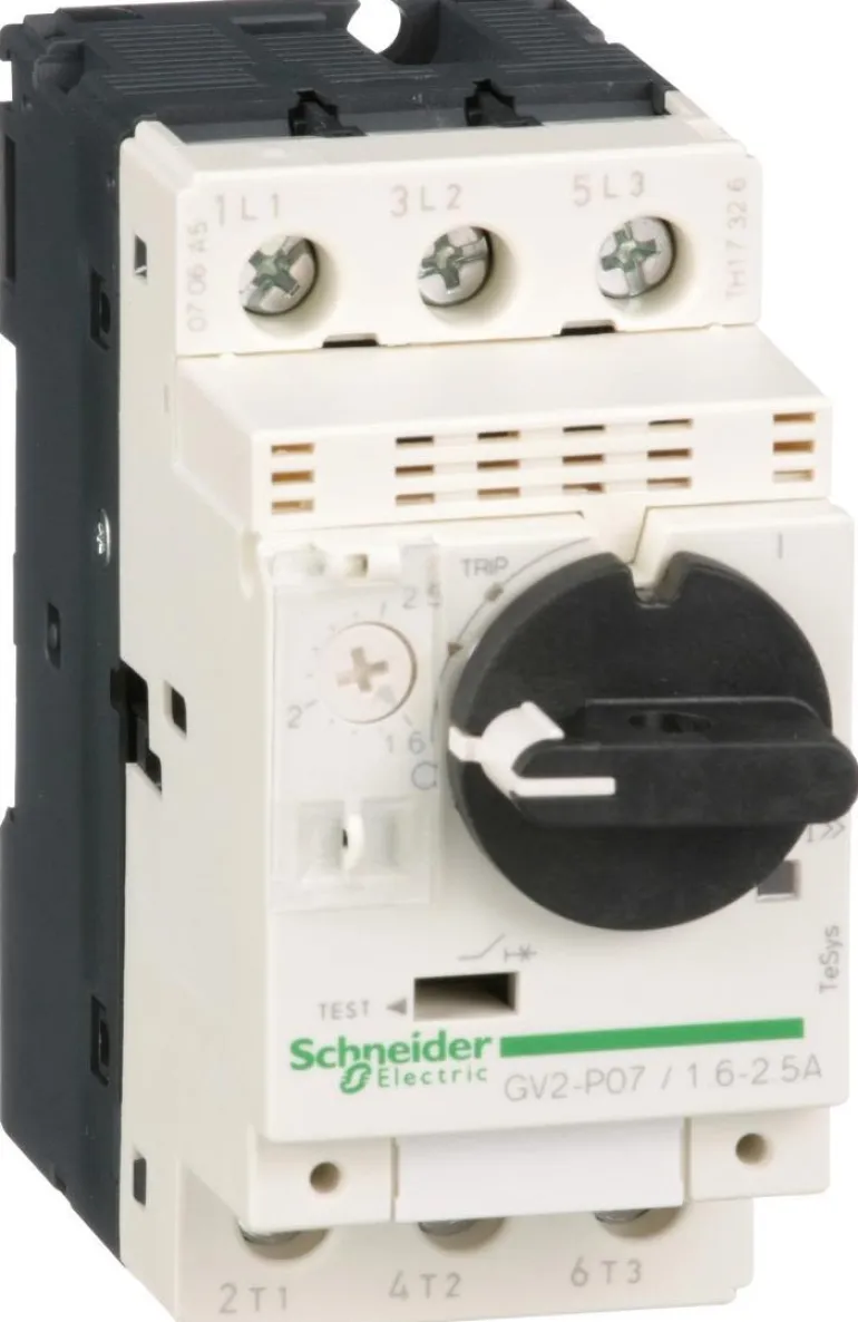 Schneider Electric GV2P10 -moottorin suojakytkin lämpömagneettisella laukaisulla. Varustettu vaihevikasuojalla.