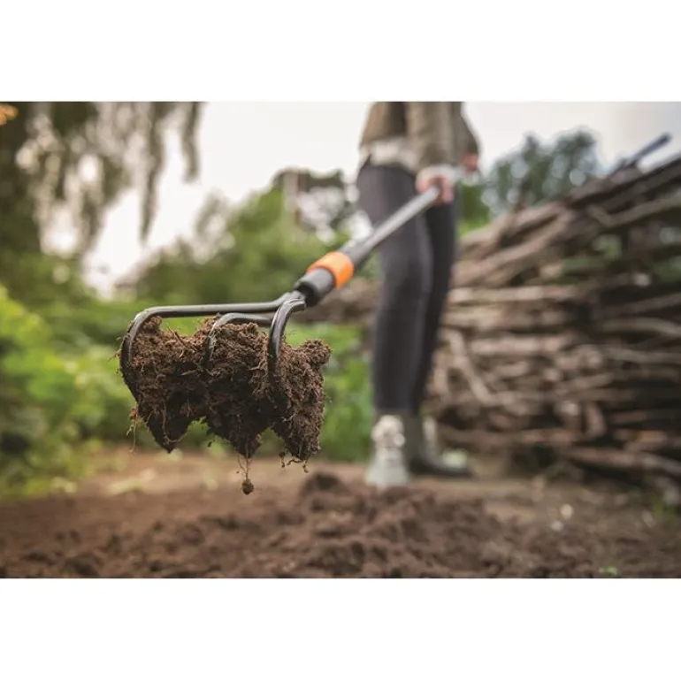 Fiskars QuikFit 1000680 on möyhennyskuokka. Mullan haraamiseen, muokkaamiseen, kuohkeuttamiseen ja pinnan rikkomiseen. Sopii kylvömaan valmisteluun ja hoitoon.