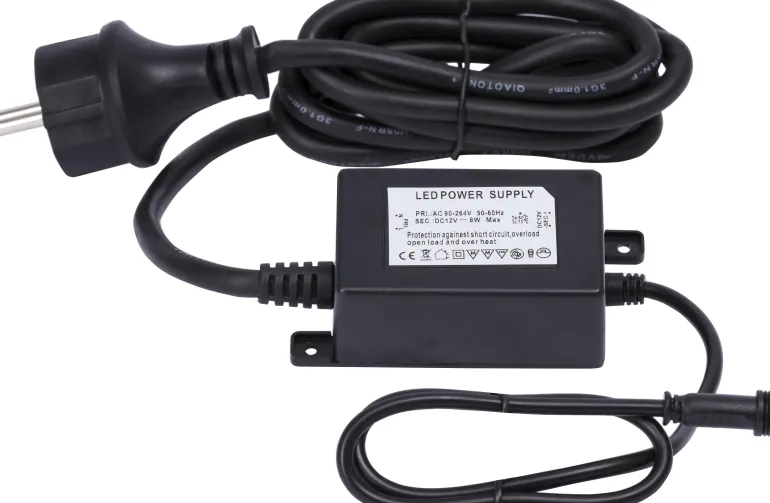 220-240 V:n muuntaja puutarhavalaistukseen, kaapelin pituus 1,7 m ja pistoke 230 V:n pistorasiaan, muuntajasta 0,45 m:n 12 V -kaapeli.