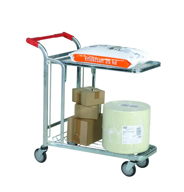 Pinottava myymälä- ja varastovaunu. Vakaa ja kätevä 2-tasoinen vaunu, joka kestää jopa 300 kg:n kuorman. Galvanoitu pinta ja muovipinnoitettu kahva lisäävät käyttömukavuutta. 4 kpl kumipintaisia 125 mm:n kuulalaakereita hiljaiseen ja helppoon käsittelyyn.