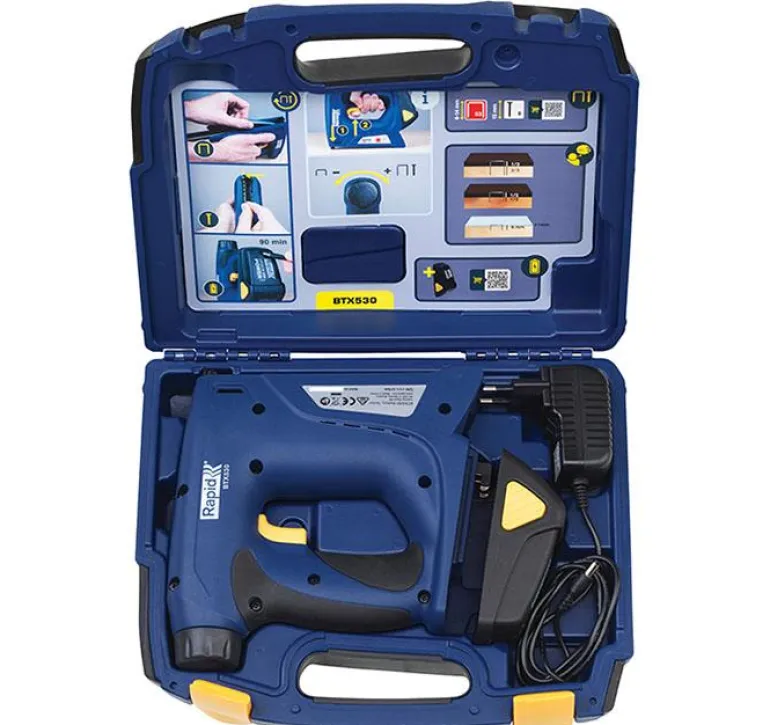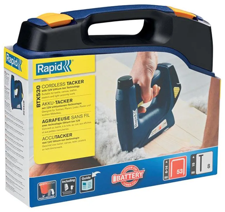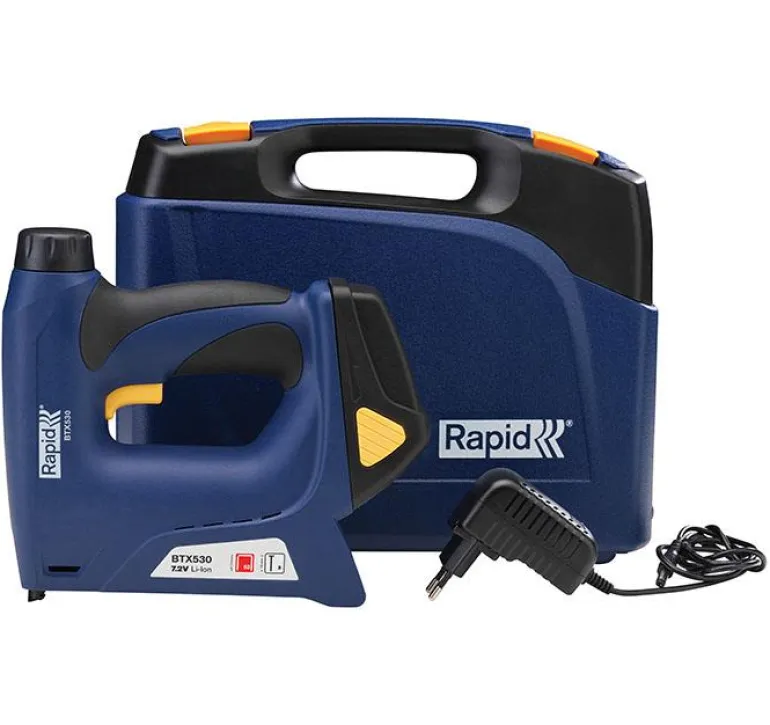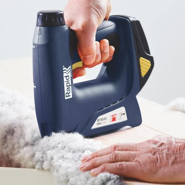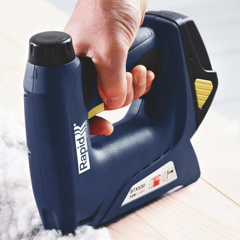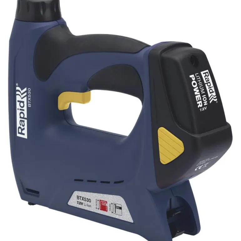 Rapid BTX530 on akkukäyttöinen 7,2 V:n niittipistooli töihin, joissa tarvitaan vapaata liikkuvuutta. Suuri akkuteho ja lyhyt latausaika takaavat pitkän työskentelyjakson ja keskeytymättömän, joustavan käytön. Ergonominen kumipäällysteinen kahva takaa täydellisen tasapainon ja tarkkuuden Rapid BTX530 soveltuu jokapäiväiseen käyttöön, kuten huonekalujen uudelleenverhoiluun, tekstiilien koristeluun ja mattojen, nahan sekä ohuen puumateriaalin kiinnitykseen.