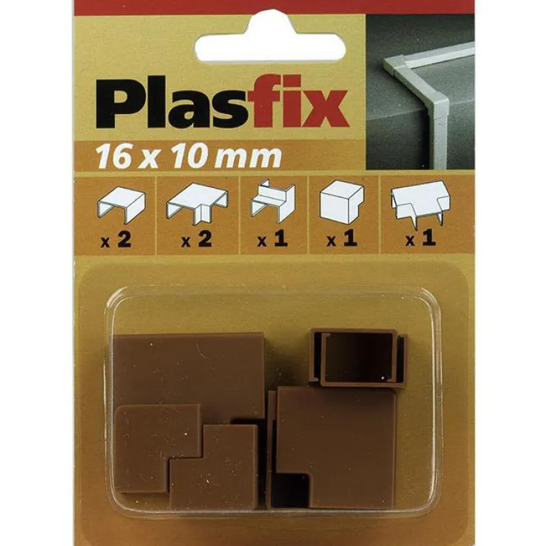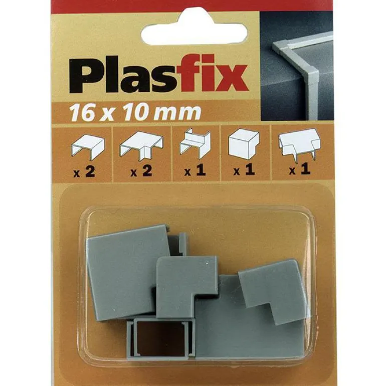 Sarja, jossa on Plasfix-kaapelikanavien liitos- ja kulmakappaleet. Pakkaus sisältää 7 erilaista mallia.