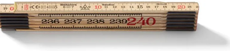 Hultaforsin klassinen nivelmitta metriasteikolla, pidempi versio. Sama korkea laatu ja ominaisuudet, mutta 2,4 metrin malli on mukautettu nykyisiin rakennusnormeihin/-standardeihin. Perinteisesti valmistettu hieskoivusta, jossa on ruotsalaista terästä olevat nivelet ja Hultaforsille tyypilliset punaiset päät.