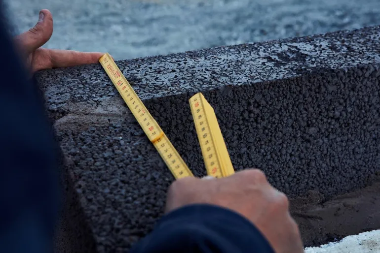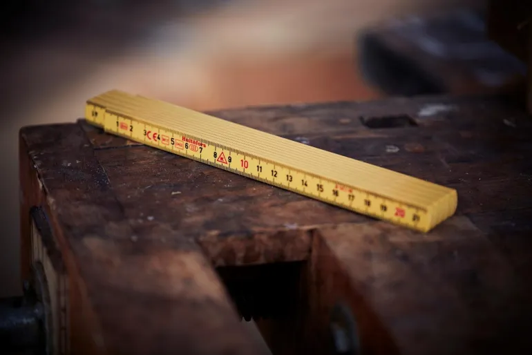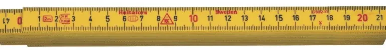 Lasikuituvahvisteisesta polyamidista valmistettu nivelmitta, joka kestää hyvin kosteutta. Musta metrinen asteikko molemmilla puolilla, punaiset desimaalinumerot.