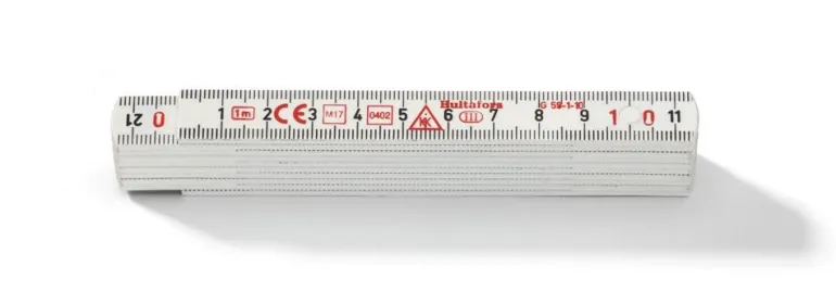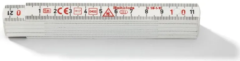 Lasikuituvahvisteisesta polyamidista valmistettu nivelmitta, joka kestää hyvin kosteutta. Musta metrinen asteikko molemmilla puolilla, punaiset desimaalinumerot.