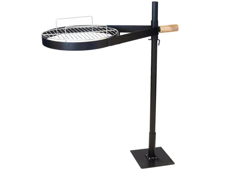 Kätevä teline nuotiopaikalle, korkeussäädettävä paistotaso grilliritilällä. Nuotioteline pultataan alustaan (esim. betonilaattaan) tai upotetaan maahan.
