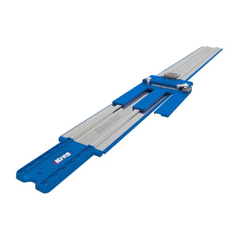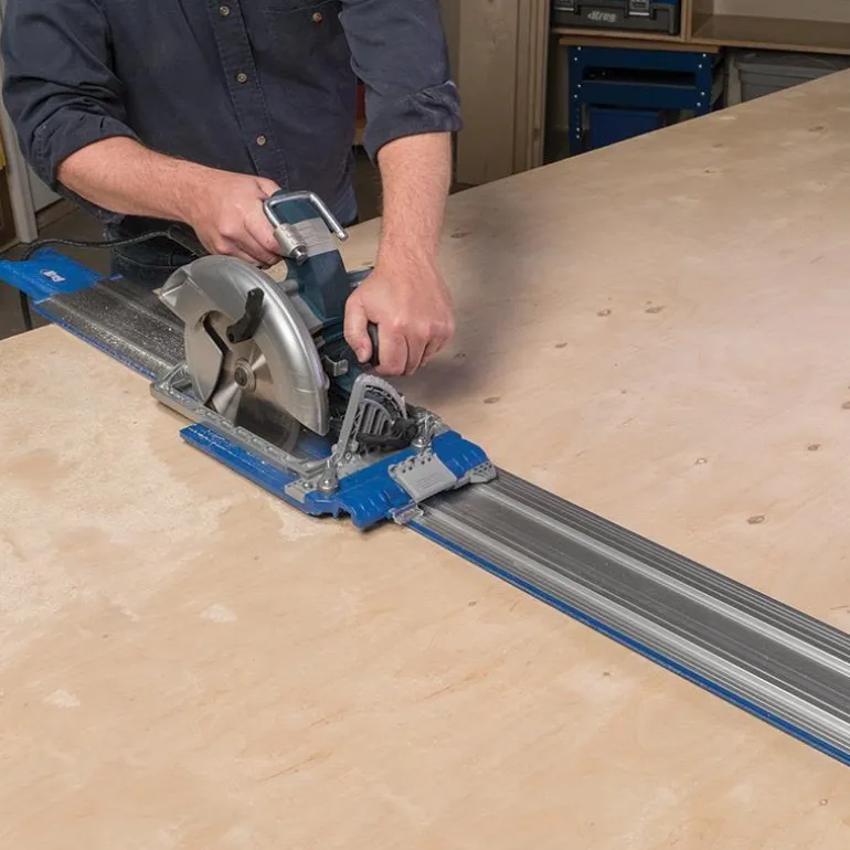 Kreg KMA2700 -ohjainkisko enintään 121 cm leveiden levymateriaalien leikkaamiseen. Ohjainkiskolla sahaat lohkeamattomia suoria sahauksia.