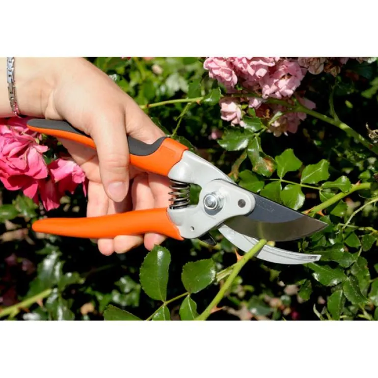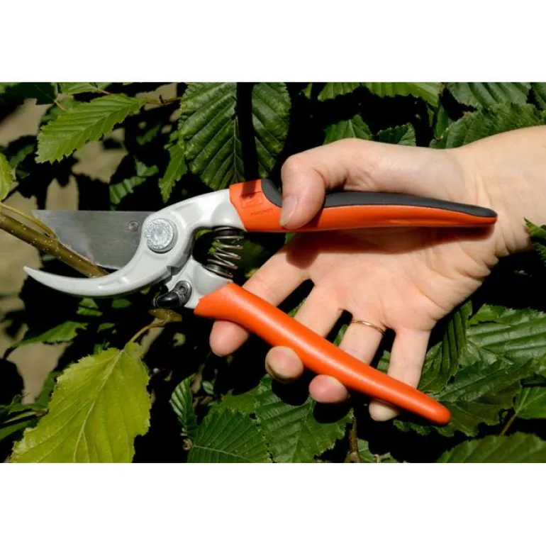 Bahco P5-23-F -oksasakset 230 mm esim. hedelmäpuiden leikkaamiseen, kun halutaan nopeasti paraneva siisti haavapinta. Oksiin pääsee hyvin käsiksi kapealla leikkuupäällä ja kahvojen kaksikomponenttipinta takaa mukavan otteen ja käyttömukavuuden myös viileällä säällä. Saksissa on vankat taotut kahvat ja yhdellä kädellä käytettävä lukitus.