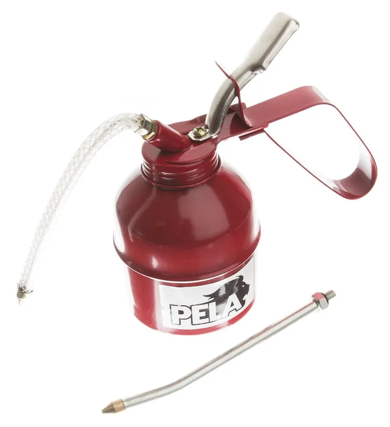 PELA 489063 on punainen öljykannu metallista. Kannussa 90 mm kiinteä metallinen putki ja joustava 180 mm muovinen putki.