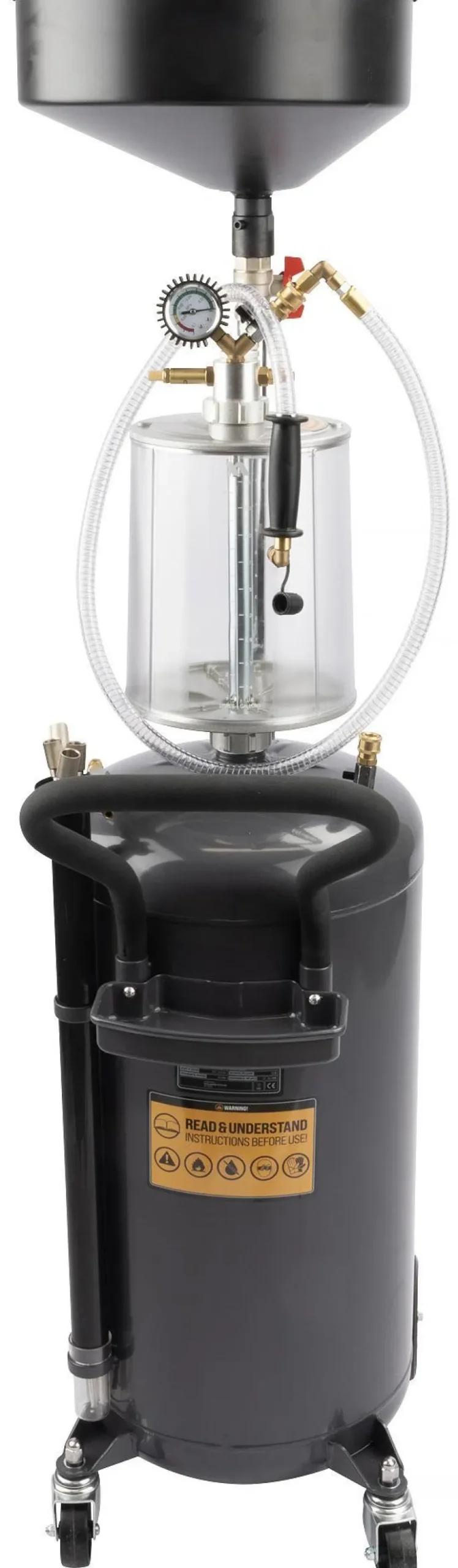 Ammattitason öljyn imuvaihtaja, joka helpottaa öljyn käsittelyä ja imemistä korjaamossa tai autotallissa. 9 litran asteikolla varustetun säiliön ja keräyssuppilon ansiosta öljyn poistaminen eri lähteistä on sujuvaa.