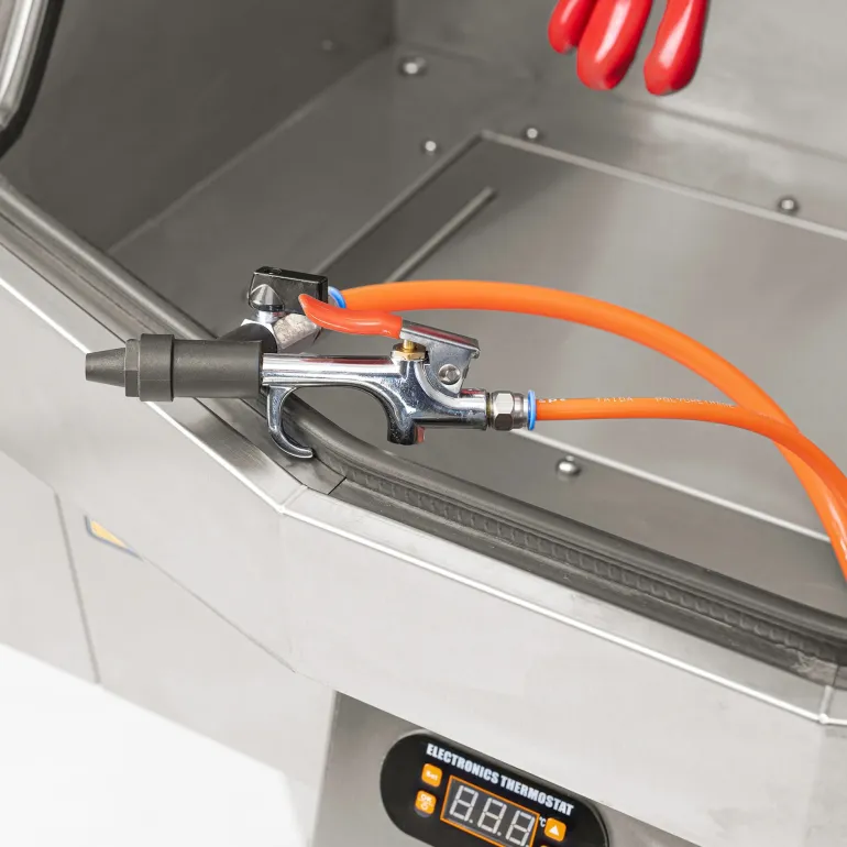Pesuri on myös varustettu ilmaverhojärjestelmällä, joka puhaltaa ilmaa ja pitää katseluikkunan vapaana höyryistä ja hiukkasista puhdistuksen aikana. LED-valaistus tarjoaa optimaalisen työvalaistuksen, ja digitaalinen lämpötilansäätö takaa puhdistusnesteen tasaisen lämmityksen. Nestepintatason valvonta ja ylikuumenemissuoja lisäävät turvallisuutta ja estävät virheellisen käytön. Kaapissa on myös digitaalinen termostaatti, valaistus, poistoilmapuhallin, paineensäädin ja manometri. Käyttö edellyttää kompressoria, vähintään 3 hv. Käytä vain suositeltuja puhdistusaineita, älä käytä dieseliä, bensiiniä, tinneriä, rasvanpoistoaineita tai muita siihen soveltumattomia aineita. (*käytä vain puhdistusaineita, joiden leimahduspiste on 120 °C tai korkeampi).
