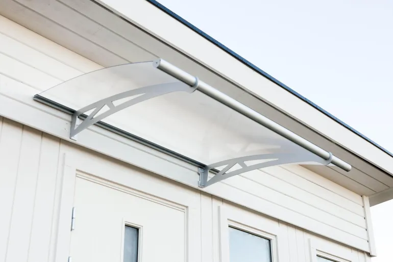 Ovikatos jauhemaalatulla alumiinirungolla ja kirkkaalla polykarbonaattilevyllä. Säädettävä kiinnitys sivuttaissuunnassa.