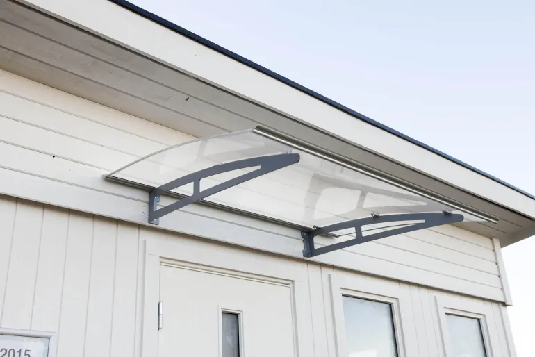 Ovikatos jauhemaalatulla alumiinirungolla ja kirkkaalla polykarbonaattilevyllä.