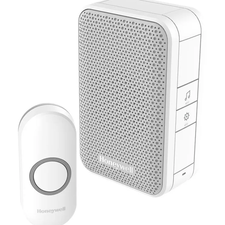 Honeywell Home DC313N on langaton kannettava ovikello, jossa on äänenvoimakkuuden säätö ja painike – valkoinen.