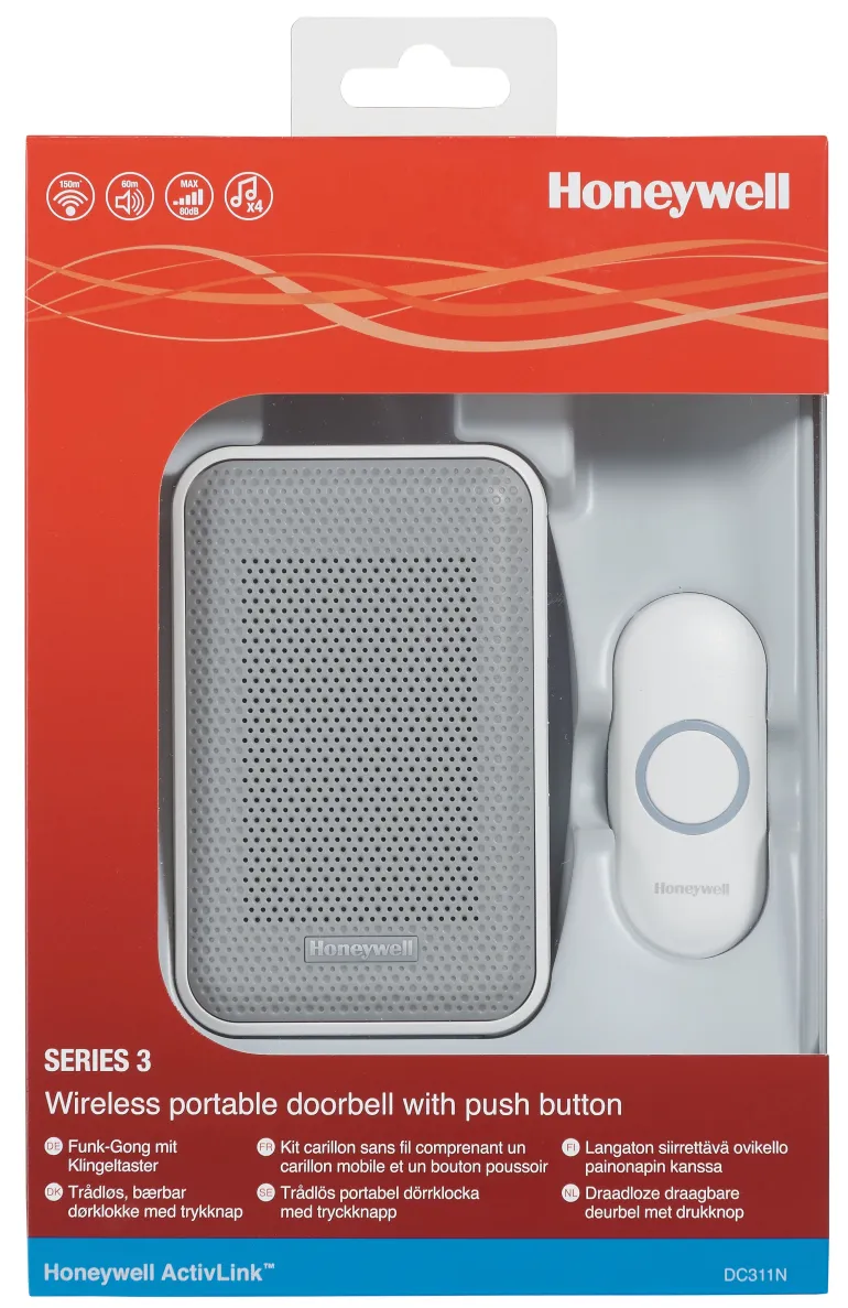 Honeywell Home DC311N on 868 MHz:n langaton ovikello, jossa on säänkestävä painonappi. Kellossa on laadukas ääni ja kantama jopa 150 metriä esteettömässä tilassa. Neljä soittoääntä. Ovikello toimii neljällä LR06 AA (alkali)paristolla ja se voidaan asentaa seinään. Sisältää seinäkiinnikkeen ja painonapin pariston.
