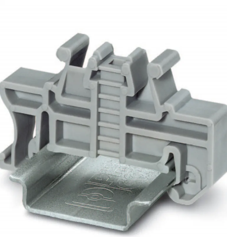 Kiskon harmaa päätytuki. Ei tarvitse ruuvata kiinni 35 mm:n kiskoon.