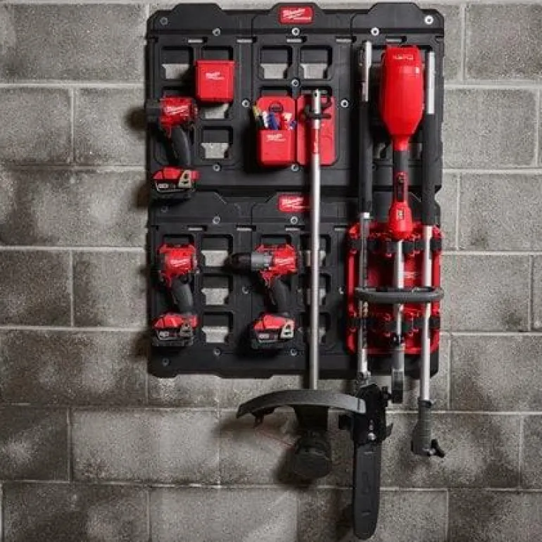 Milwaukee 4932480622 PACKOUT™ XL-kiinnitysalusta useilla liitäntämahdollisuuksilla. Kiinnitysalustalla voit hyödyntää PACKOUT™-sarjan osia kiinteään varastointiin.