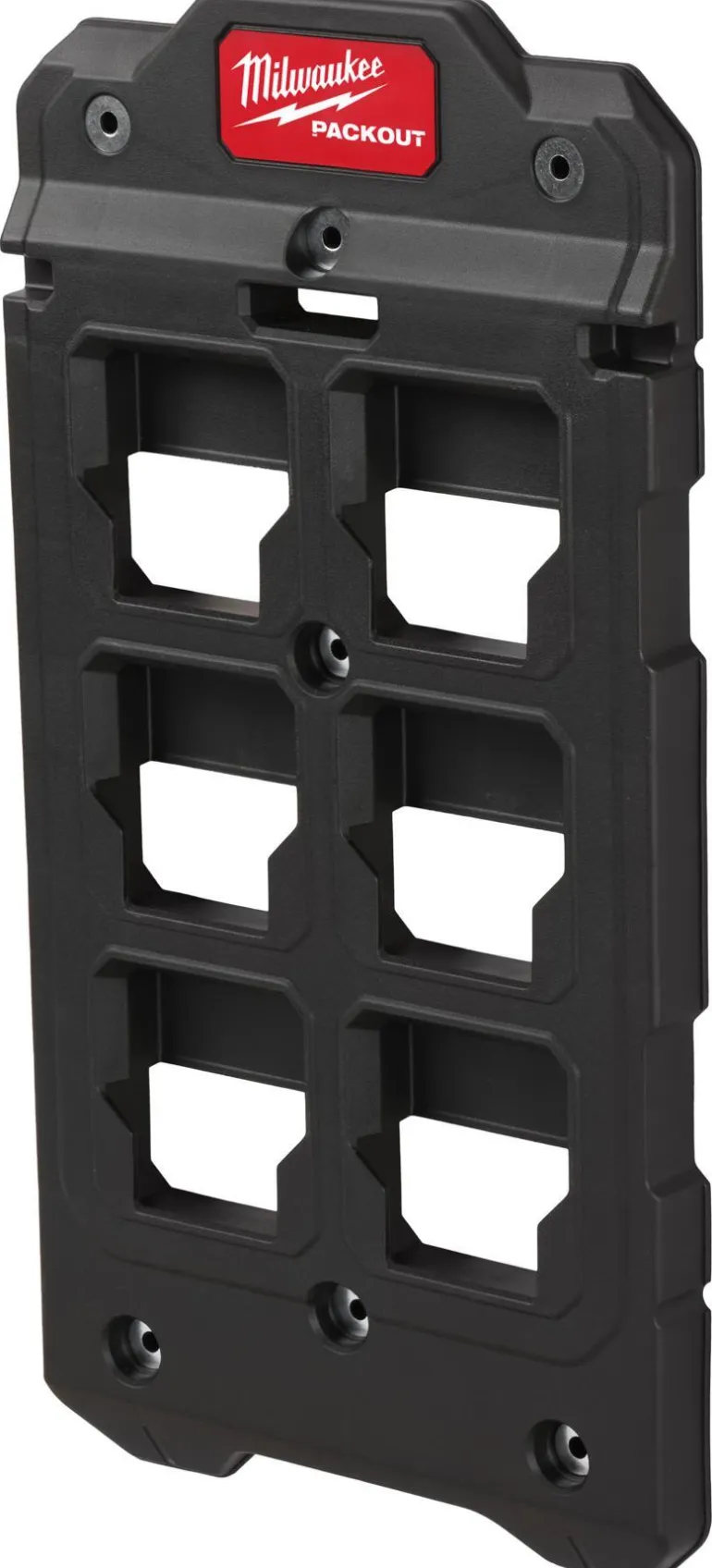 Milwaukee 4932480621 PACKOUT™-kiinnitysalusta useilla liitäntämahdollisuuksilla. Kiinnitysalustalla voit hyödyntää PACKOUT™-sarjan osia kiinteään varastointiin.