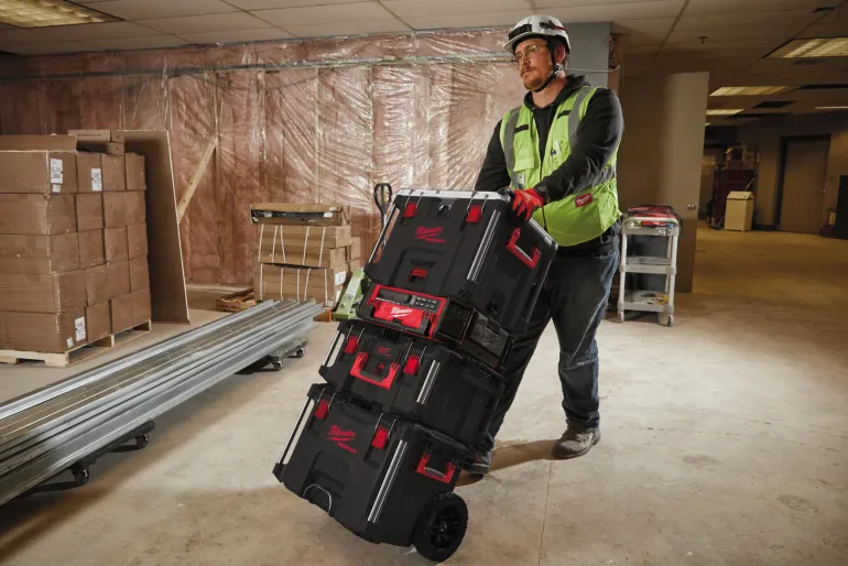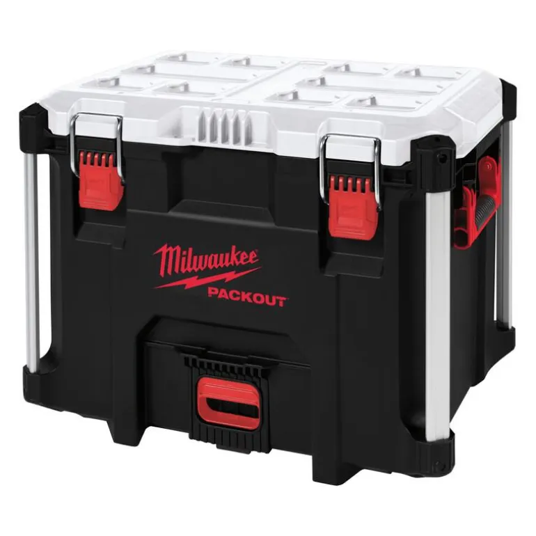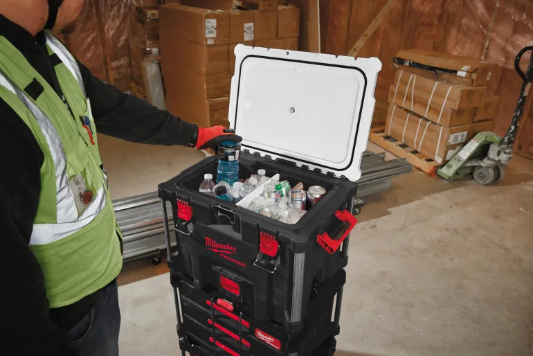 Milwaukeen PACKOUT™ XL -kylmälaatikko, jonka kaksinkertainen premiumeristys pitää sisällön kylmänä jopa 5 päivää. IP65-elintarvikeluokan vuotamaton vuoraus suojaa sisältöä roskilta ja pölyltä.