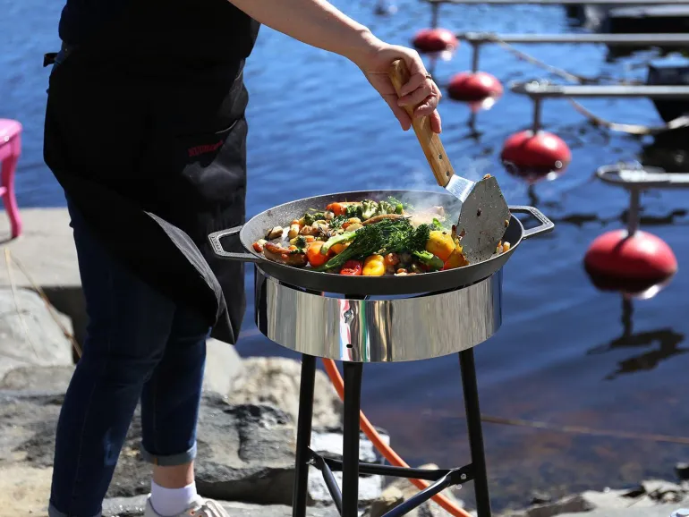 Valurautaisella Paellapannulla valmistat kätevästi kaikki ruoat, jotka vaativat reilun paistoalan sekä reunat sekoittamista varten, vaikkapa paellat, risotot ja pyttipannut. Tasapohjaisella pannulla paistat helposti myös pihvit ja kalaruoat. Paellapannu sopii Muurikka Kaasupolttimille, Sähkögrilliin sekä avotulelle.