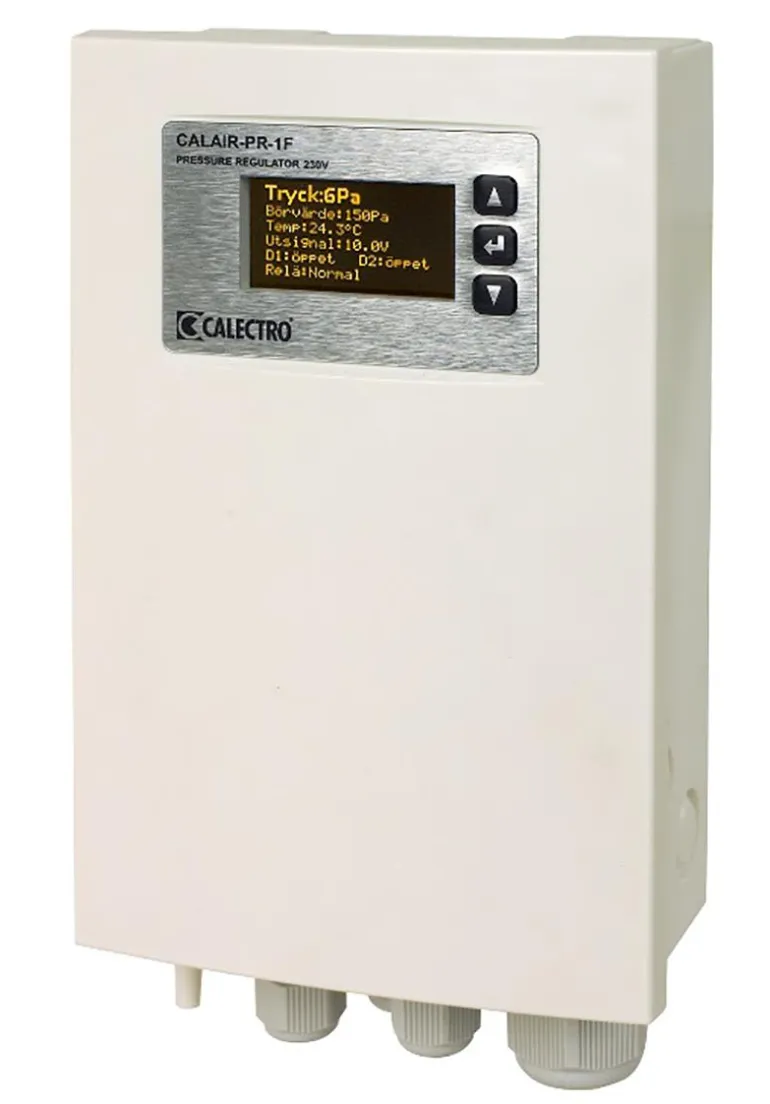 Paineensäädin CALAIR-PR mittaa paine-eron ja säätää tuuletinta 0-10V-signaalin avulla. Asetuspisteen ulkolämpötilan kompensointia varten ohjaimeen on kytketty ulkolämpötila-anturi. Ulkolämpötilan arvo voidaan kirjoittaa CALAIR-PR:ään myös Modbusin kautta. CALAIR-PR:ssä on kaksi digitaalista tuloa, joilla voidaan aktivoida vaihtoehtoinen asetusarvo. Muita valittavia esiohjelmoituja hälytystoimintoja ovat puhaltimen moottorin valvonta ja tulo palohälytyskeskuksesta. Näissä hälytystoiminnoissa on myös mahdollista valita, mitä lähtösignaalia tulisi käyttää ja pitääkö ne nollata automaattisesti vai manuaalisesti. CALAIR-PR on varustettu vaihtuvilla potentiaalivapailla hälytysreleillä, jotka voidaan ohjelmoida erilaisiin hälytystapahtumiin, esim. korkea- ja matalapainehälytyksiin. Viimeiset kymmenen hälytystä tallennetaan hälytyslokiin. CALAIR-PR voidaan lukea ja ohjelmoida Modbus RTU:n (RS485) kautta. Säätönopeutta voidaan mukauttaa erilaisiin paineensäätösovelluksiin, kuten kattotuulettimiin. Kaikki valikkojärjestelmän kautta tehdyt asetukset ja ohjelmointi tallentuvat sähkökatkoksen sattuessa. Paineensäätimen toiminta on taattu letkun pituuteen 100 m asti. Tarkista asennuksen jälkeen, että ilma pääsee virtaamaan vapaasti letkun läpi. CALAIR-PR:ssä on kellomoduuli vaihtoehtoisen asetusarvon aktivoimiseksi. Kellomoduulissa on paristovarmennus, jotta asetukset eivät katkea sähkökatkoksen sattuessa. Päivämäärä ja kellonaika sekä viikoittainen aikataulu voidaan asettaa. Lyhin aikataulutettava aika on yksi tunti.