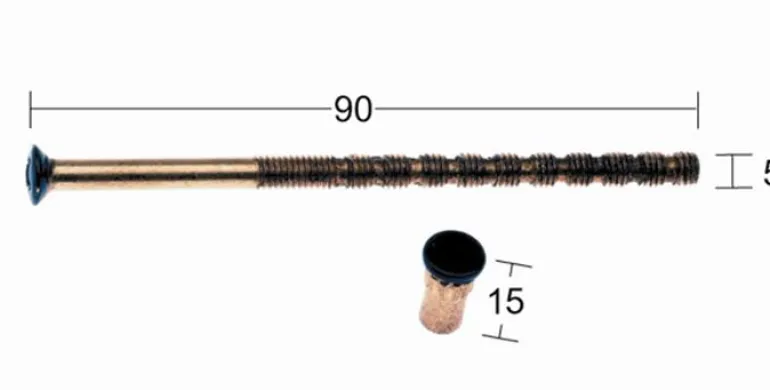 Leikattava 90 mm ruuvi, jossa nikkelistä valmistettu hylsymutteri sylinterinupille ja ovenkahvalle. Kierre M5.