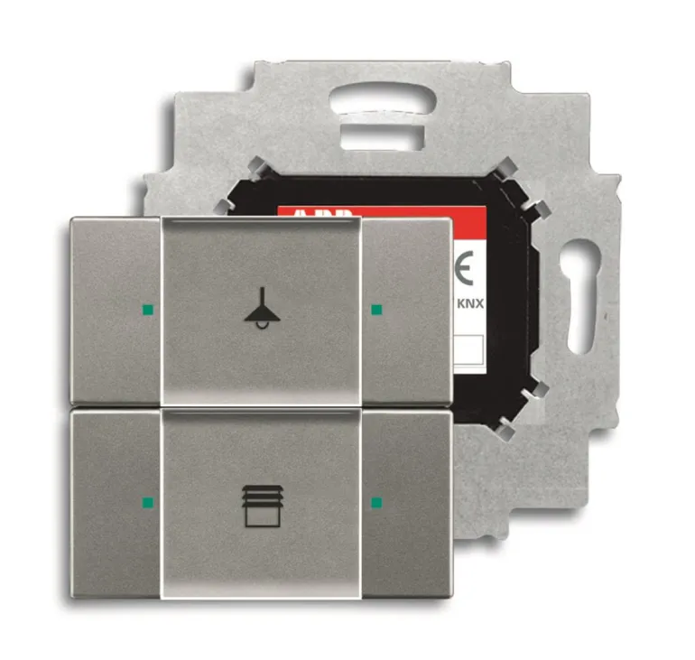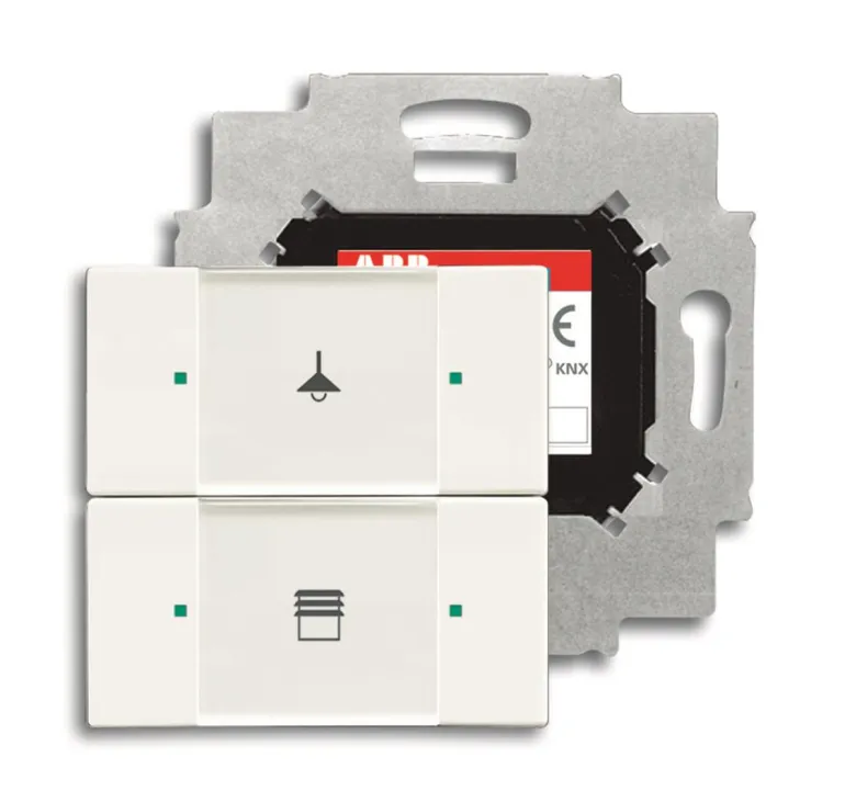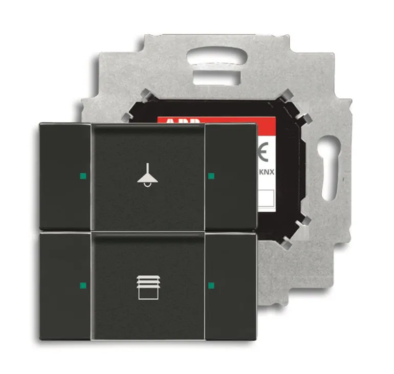 Painike mukana tulevan väyläliitäntäyksikön asennusta varten. Käytetään on/off-ohjaukseen tai himmentämiseen. Keinuvivuissa on vihreä/punainen LED-valo ja suuri tekstikenttä, jossa voidaan käyttää mukana tulevia symboleja. Peitelevy tilattava erikseen.