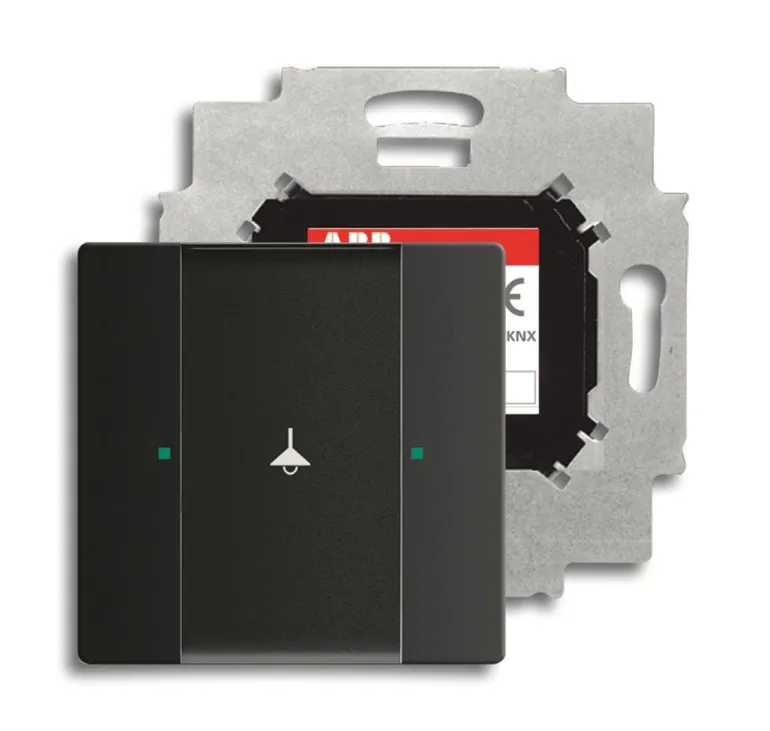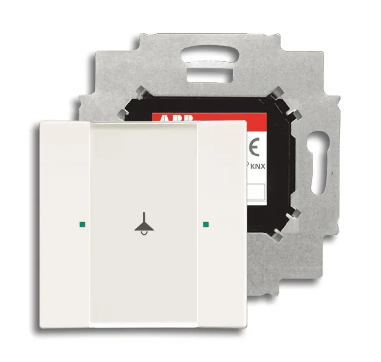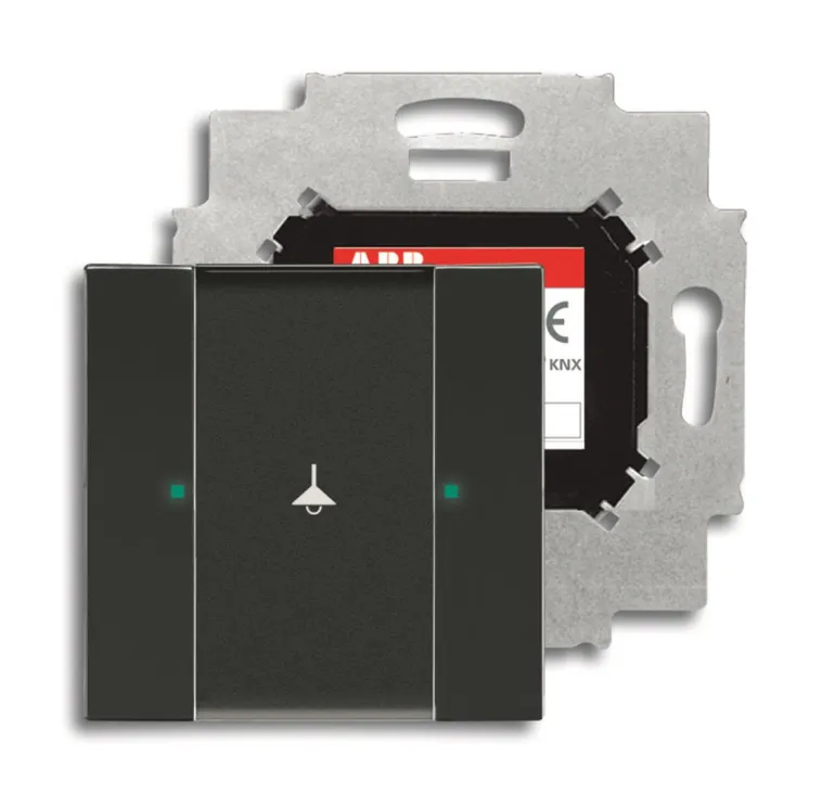 Painike mukana tulevan väyläliitäntäyksikön asennusta varten. Käytetään on/off-ohjaukseen tai himmentämiseen. Keinuvivuissa on vihreä/punainen LED-valo ja suuri tekstikenttä, jossa voidaan käyttää mukana tulevia symboleja. Peitelevy tilattava erikseen.