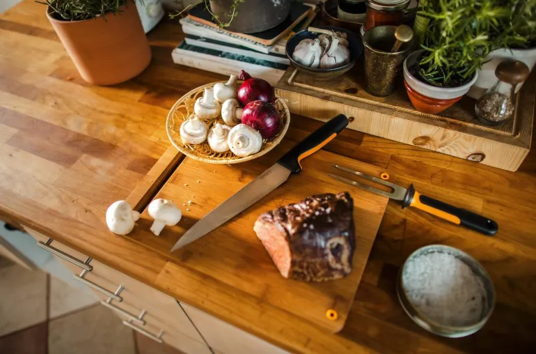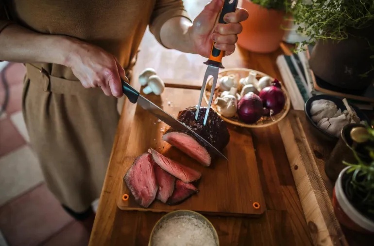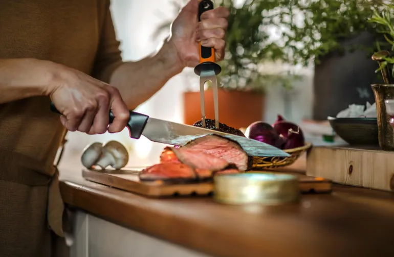 Suora terä, jossa on hieno reuna ja joka sopii täydellisesti lihan leikkaamiseen. Veitsenterä on valmistettu kestävästä japanilaisesta ruostumattomasta teräksestä. Ergonomisesti suunnitellussa kahvassa on hyvin asennettu sormensuojus. Kaikki Fiskars Functional Form -sarjan veitset ovat konepesunkestäviä.