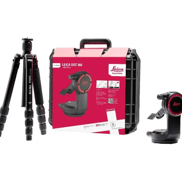 Leica-paketti sisältää TRI 120 -jalustan ja DST 360 -kallistusadapterin. Mukana laukku.