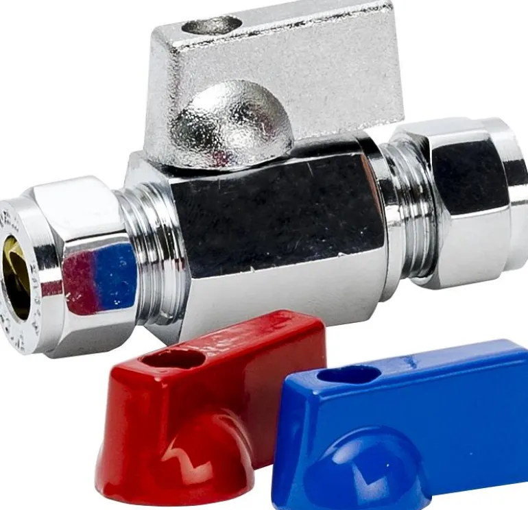 Palloventtiili kahdella puristinliittimellä ja säätönupilla. Suora muotoilu, mukaan lukien tukiholkki.