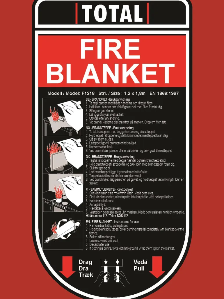 120×180 cm lasikuitumateriaalista valmistettu palohuopa. Tarjoaa tehokkaan ensikäden suojan esim. tekstiilien ja vaakasuorien pintojen, kuten kattiloiden, pannujen, liesien ja sänkyjen, tulipalojen varalta.