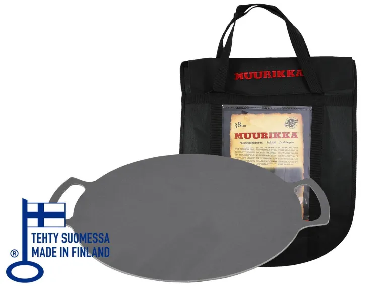 Kuumavalssatusta teräksestä valmistetussa pannussa on irrotettavat jalat. Sopii kaasupolttimen päälle, sähkögrilliin tai avotulelle. Halkaisija 38 cm.