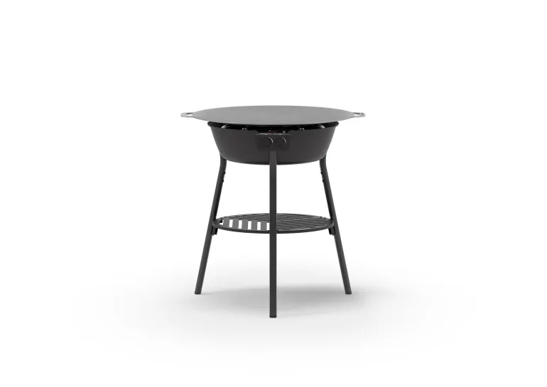Tyylikäs, harkitusti muotoiltu pannusetti, johon sisältyy emaloitu kaasupoltin ja tukeva metallijalusta säilytystasolla, jossa on pitkät D-profiilijalat. Settiin kuuluu myös kuumavalssatusta teräksestä valmistettu pannu, jonka halkaisija on 78 cm.
