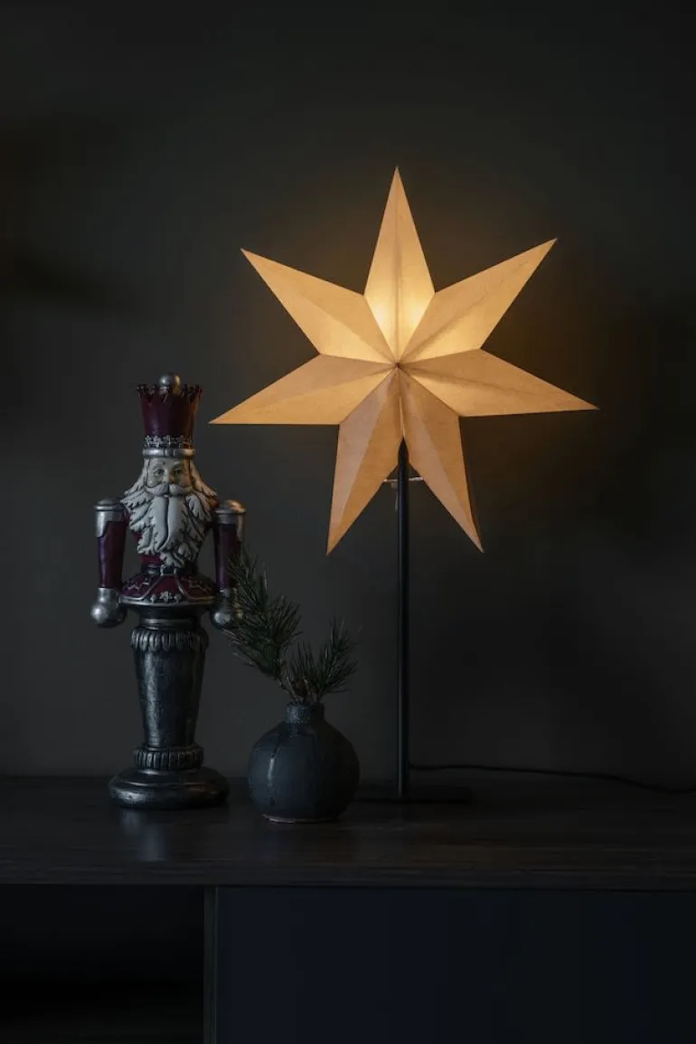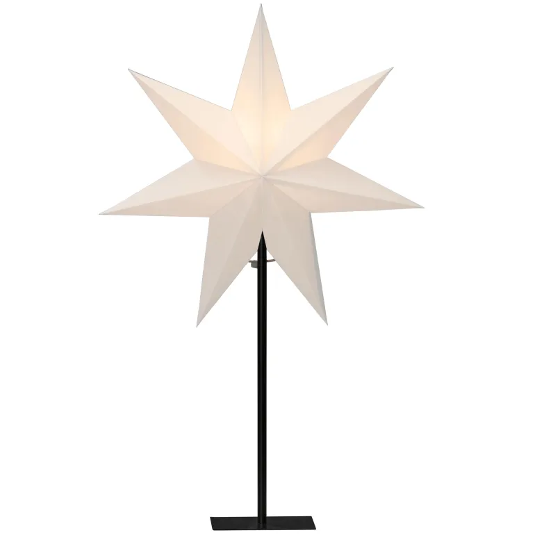 Konstsmide 1761-200 on valkoinen paperitähti 40×65 cm mustalla metallisella jalustalla. 230V/IP20.