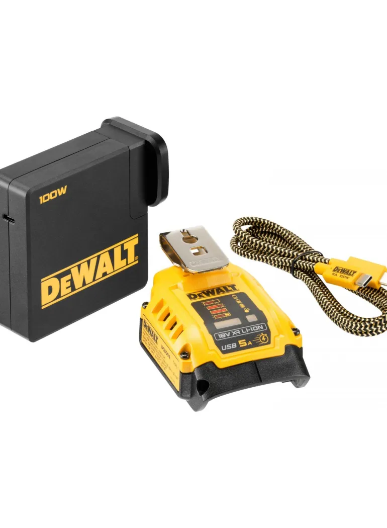 18V USB -sovitin lataukseen ja virtalähteeksi; sen avulla voit muuntaa minkä tahansa 18V XR DEWALT -akun kannettavaksi laturiksi eri elektroniikkalaitteille, kuten puhelimille, tableteille, kannettaville tietokoneille, langattomille kaiuttimille/kuulokkeille ym. Kaksisuuntainen toiminto mahdollistaa sen käytön latauslaitteena 18V XR DEWALT -akkujen kanssa (5 A), kun käytetään mukana toimitettavaa kaapelia ja adapteria (muut kaapelit/sovittimet voivat hidastaa latausnopeutta). Loppukäyttäjä voi yhdistää laitteen auton USB-porttiin ja ladata DEWALT-akut liikkeellä ollessaan.