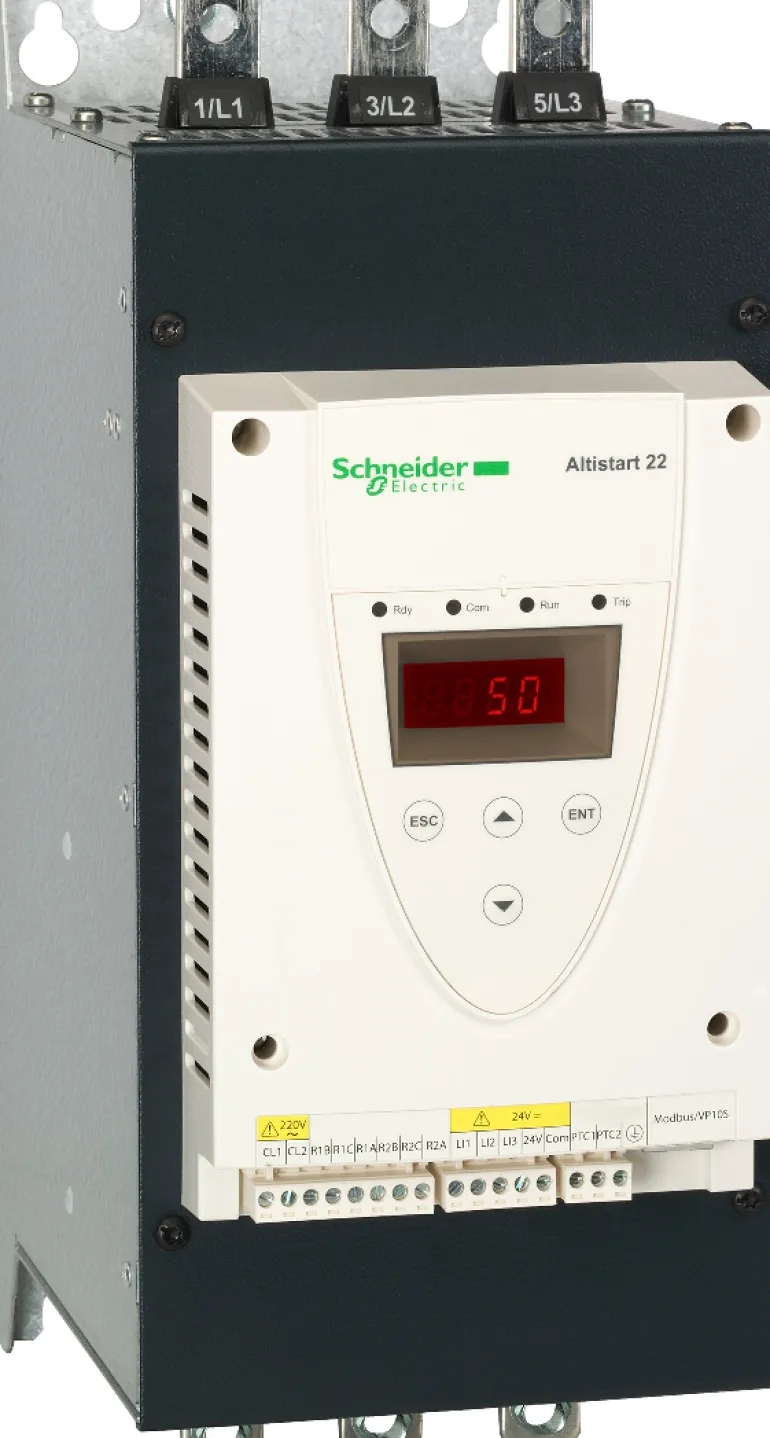Altistart 22:ssa on vakiona sisäänrakennettu ohitustoiminto, ja se voidaan kytkeä suoraan moottorin liittimiin tai sarjaan kunkin moottorin käämin kanssa kolmioliitännällä. Pehmeä käynnistin voi sekä nostaa että laskea pumppuja hallitusti, ja voit valita tyypin moottorin jännitteen ja tehon mukaan. Se on kätevä ja helppokäyttöinen, ja se kommunikoi sisäänrakennetun Modbus-viestinnän kautta. Se ohjelmoidaan suoraan sisäänrakennetusta ohjauspaneelista tai PC- ja SoMove-ohjelmistojen kautta.