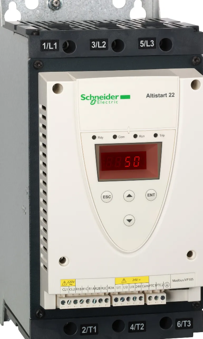 Altistart 22:ssa on vakiona sisäänrakennettu ohitustoiminto, ja se voidaan kytkeä suoraan moottorin liittimiin tai sarjaan kunkin moottorin käämin kanssa kolmioliitännällä. Se vetää pumppuja sekä ylös että alas hallitusti. Pehmeä käynnistin on tasainen ja pystyy kommunikoimaan sisäänrakennetun Modbus-yhteyden kautta, ja se ohjelmoidaan suoraan sisäänrakennetusta paneelista tai PC- ja SoMove-ohjelmistojen kautta. Valitse tyyppi moottorin jännitteen ja tehon mukaan.