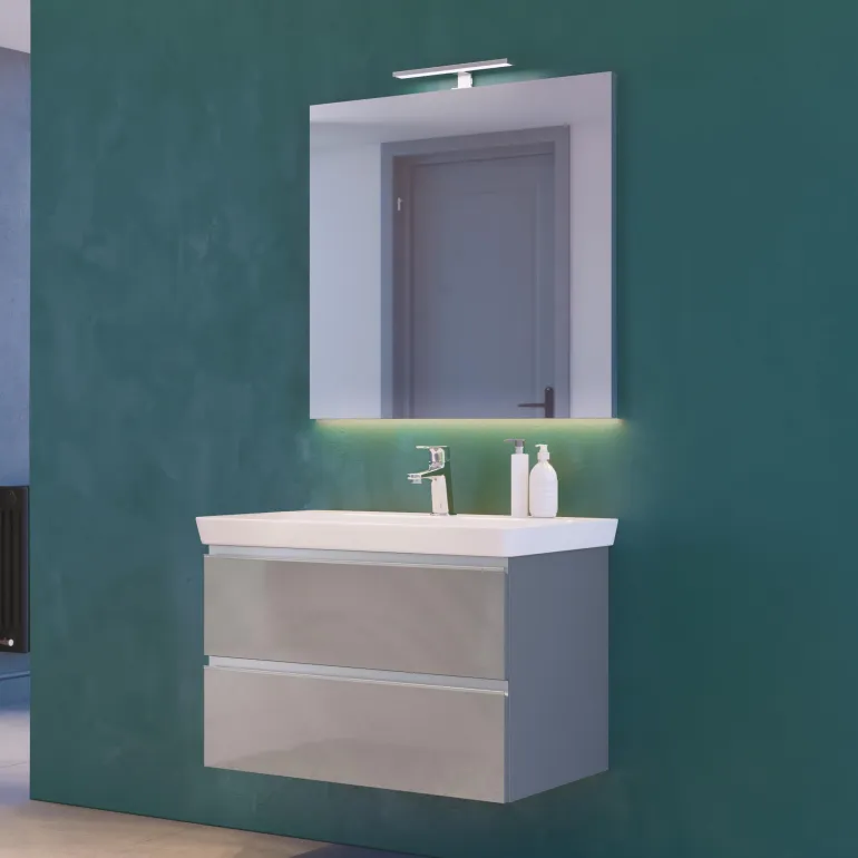 Peili valkoisilla reunoilla, yläpuolisella LED-valaistuksella (4000 K) ja piilotetulla LED-valonauhalla peilin alapuolella (4000 K). Peili on tarkoitettu seinäasennukseen (ruuvikiinnitys).