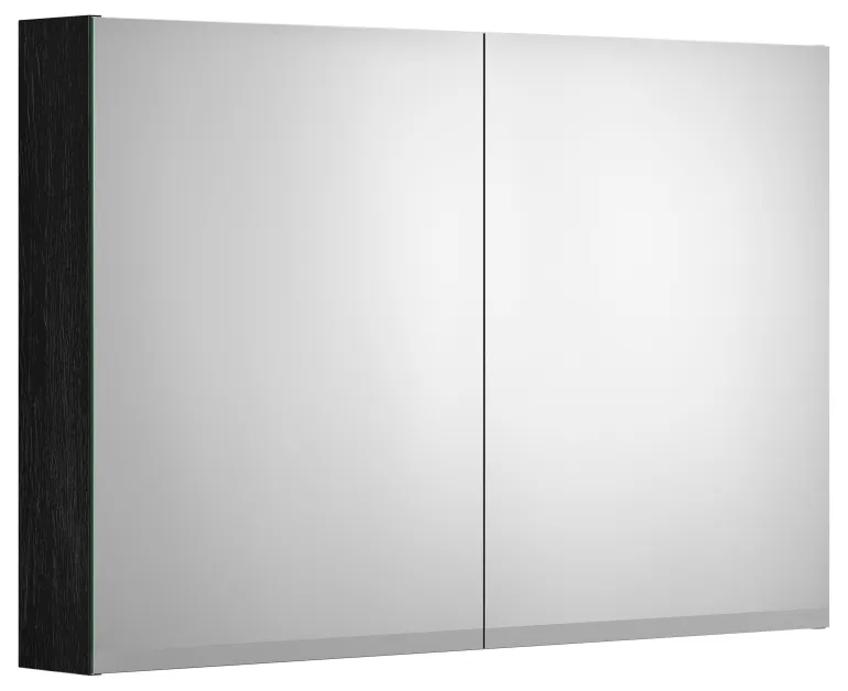 Musta peilikaappi kahdella kaksipuolisella peiliovella Gustavsbergiltä, 100 cm. Alareunat on huurrettu, jotta peiliin ei jää rasvatahroja.