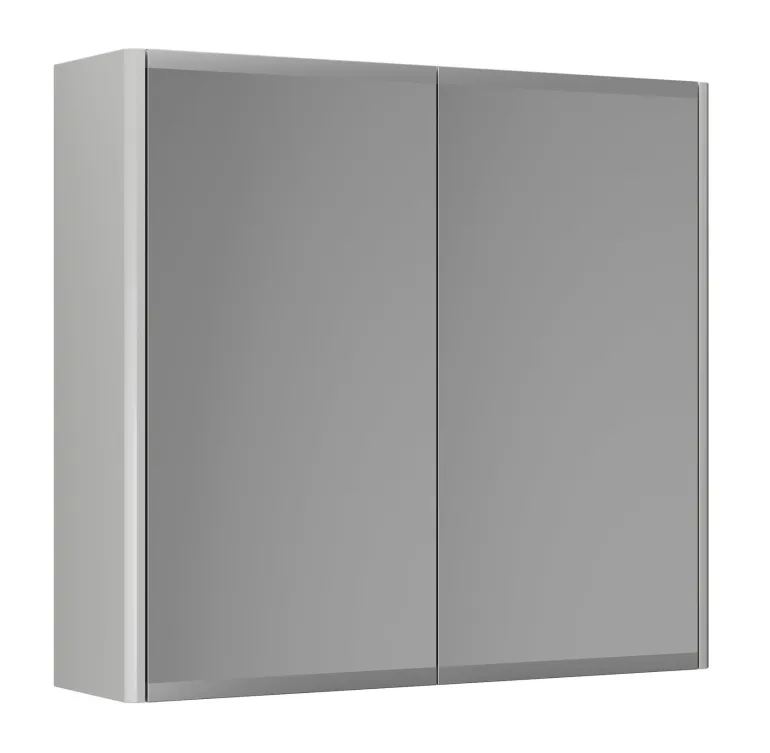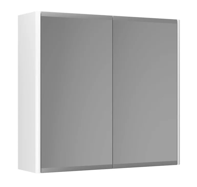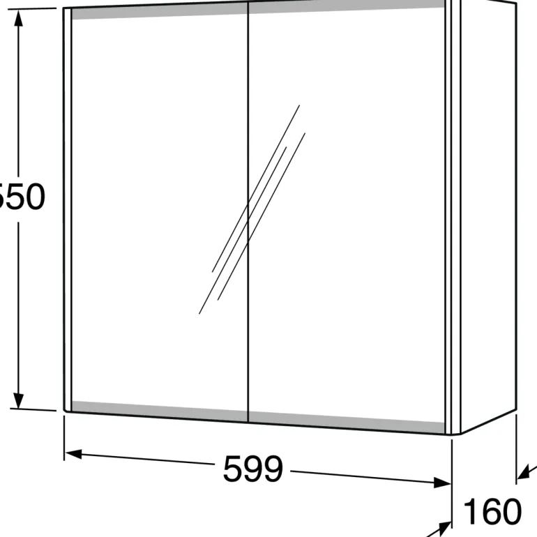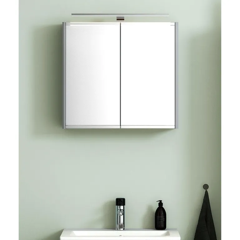 Peilikaappi, jonka leveys on 60 cm ja jossa on 2 irrotettavaa lasihyllyä. Kaksipuoliset peiliovet, joissa on huurretty alareuna himmentämässä rasvajälkiä.