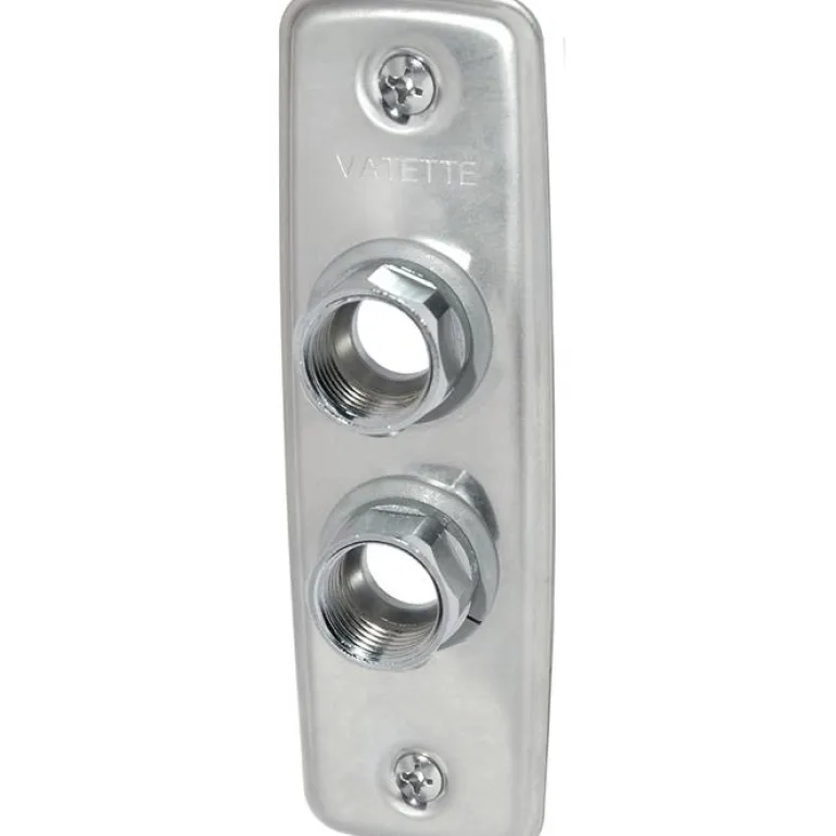 Vatette 8550615 on 2-reikäinen peitelaippa Ø 15 mm kupariputkille. Levyä voidaan käyttää myös Ø 10 ja 12 mm putkien kanssa, jos sitä on täydennetty 15×10/15×12 supistusosalla.