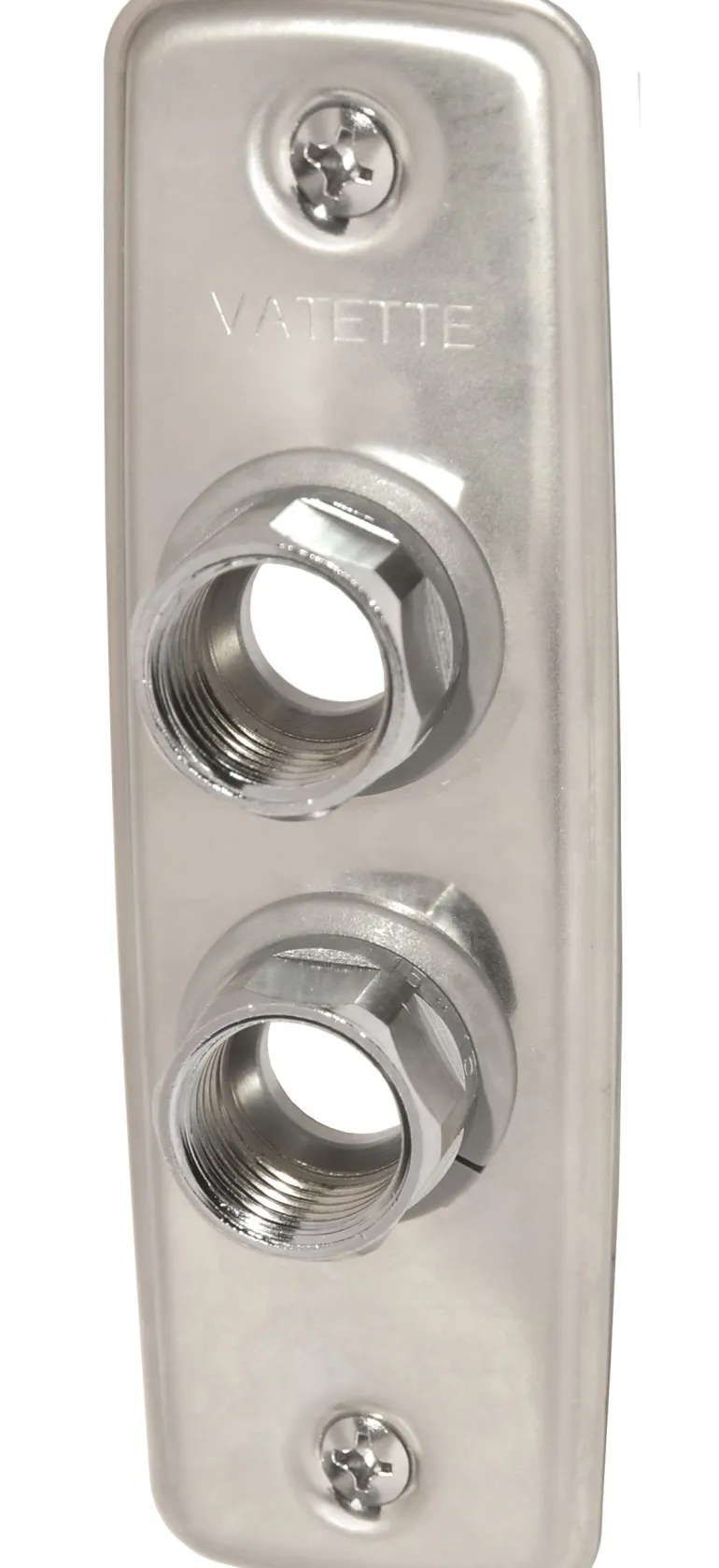 Vatette 8550613 on peitelaippa Ø 15 mm kupariputkille. Levyä voidaan käyttää myös Ø 10 ja 12 mm putkien kanssa, jos sitä on täydennetty 15×10/15×12 supistusosalla.
