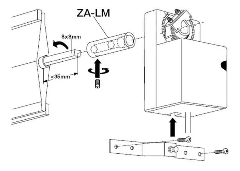 ZA-LM on akselin jatkokappale ja muunnin yhdessä tuotteessa. Käytetään asennettaessa LM..A-moottoria yleiskiinnikkeellä peltiin, jonka neliön koko on 8 x 8 mm. ZA-LM sopii lyhyisiin neliöreikäakseleihin.