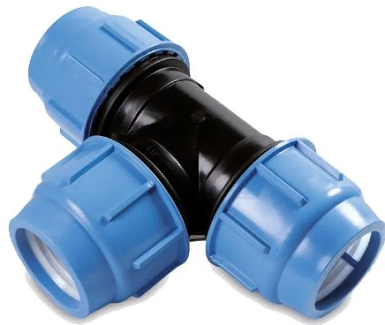 PEM-liitin, jossa T-putki ja materiaalina polypropeeni (PP). Mitta 20 mm, putken ulkohalkaisija 20 mm.