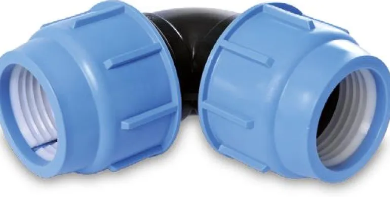 PEM-liitin, jossa 90° kulma, materiaalina polypropeeni (PP). Putken ulkohalkaisija on 32 mm.